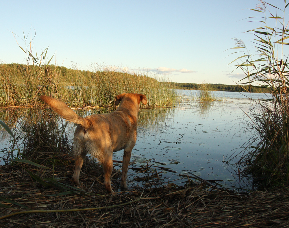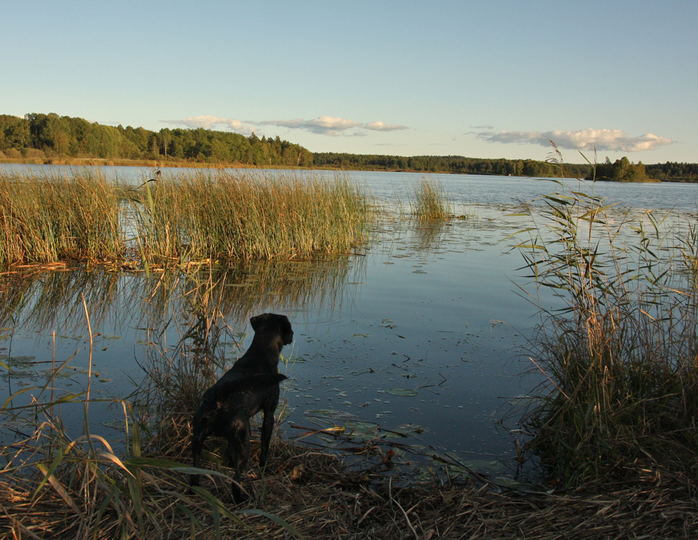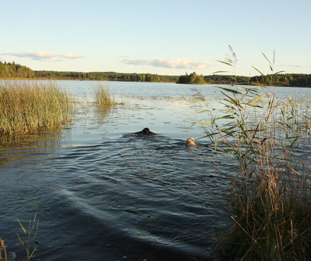 Tisdagen tillbringade Peter och Cobber på andjakt i underbart väder. När de kom hem gick vi en sväng ner till sjön och hundarna fick bada och simma lite bäst de ville.
