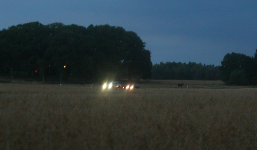 När vi väl började närma oss bilen igen var det nära nog på helt mörkt och plötsligt ser vi bilarna ute på vägen blinka med helljus och varningsblinkers.